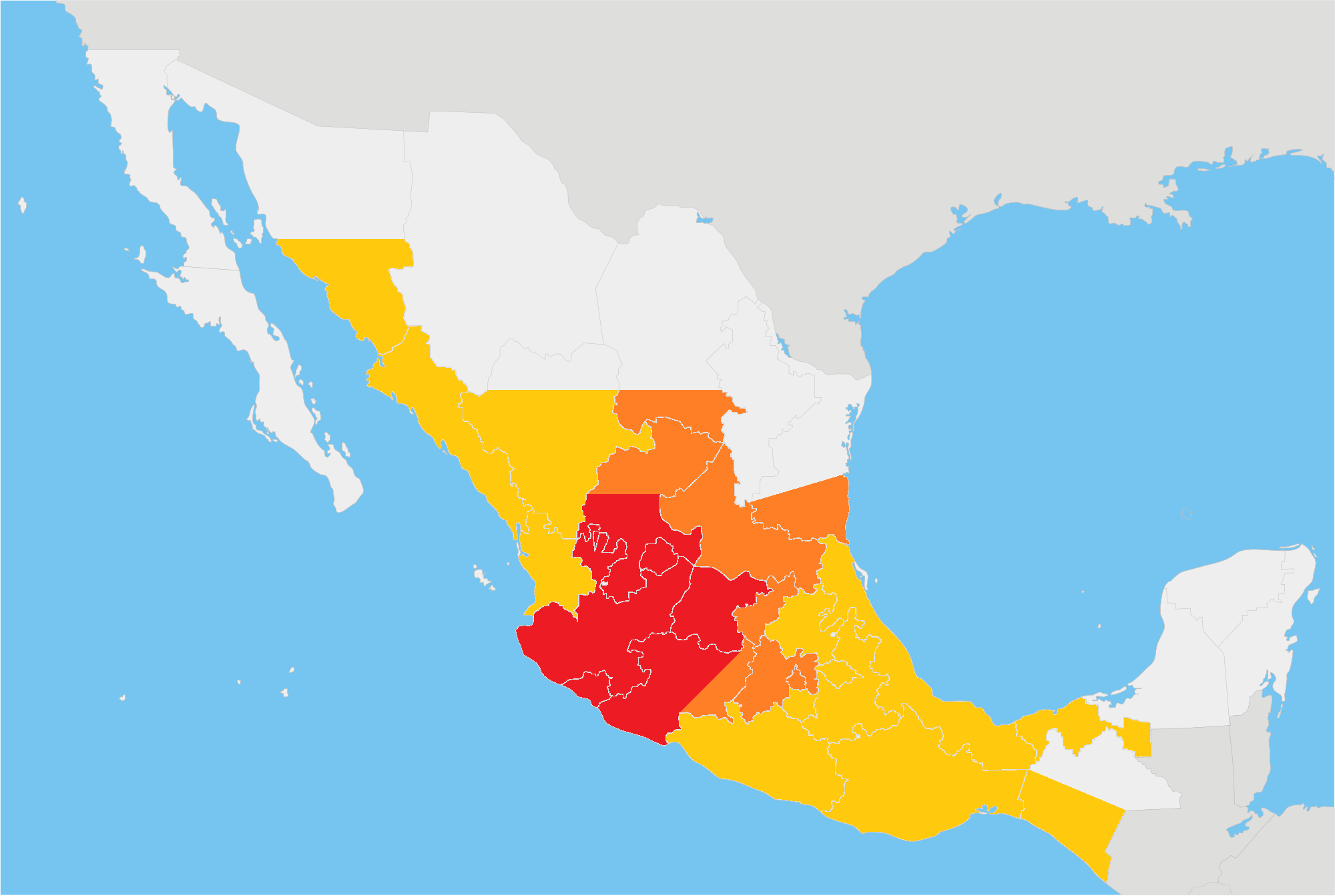 خريطة توضح الولايات المكسيكية التي شهدت قتالاً خلال حرب الكريستيرا، درجة اللون تشير إلى شدة المعارك. المصدر: ويكيميديا