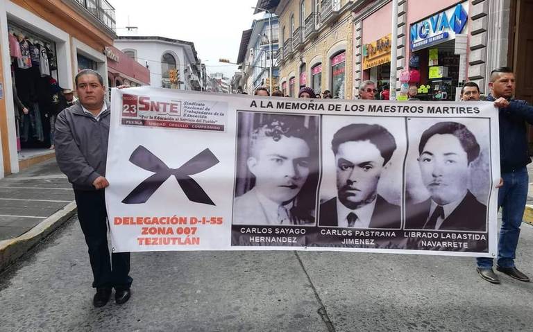 إحياء ذكرى ثلاثة معلمين اغتيلوا من قبل متمردي الكريستيروس في منطقة تيسويتلان (في ولاية بويبلا). المصدر: صحيفة إل سول دي بويبلا
